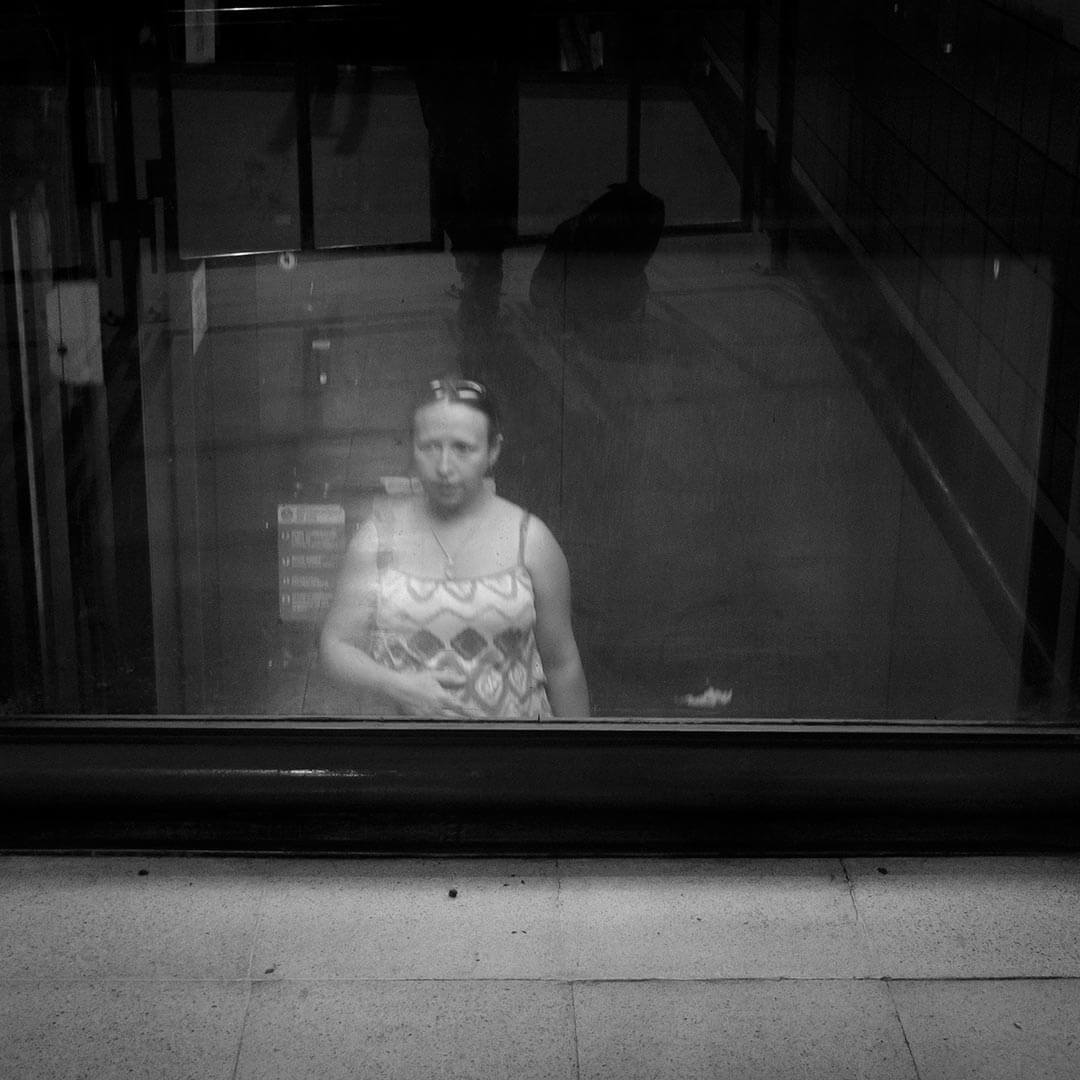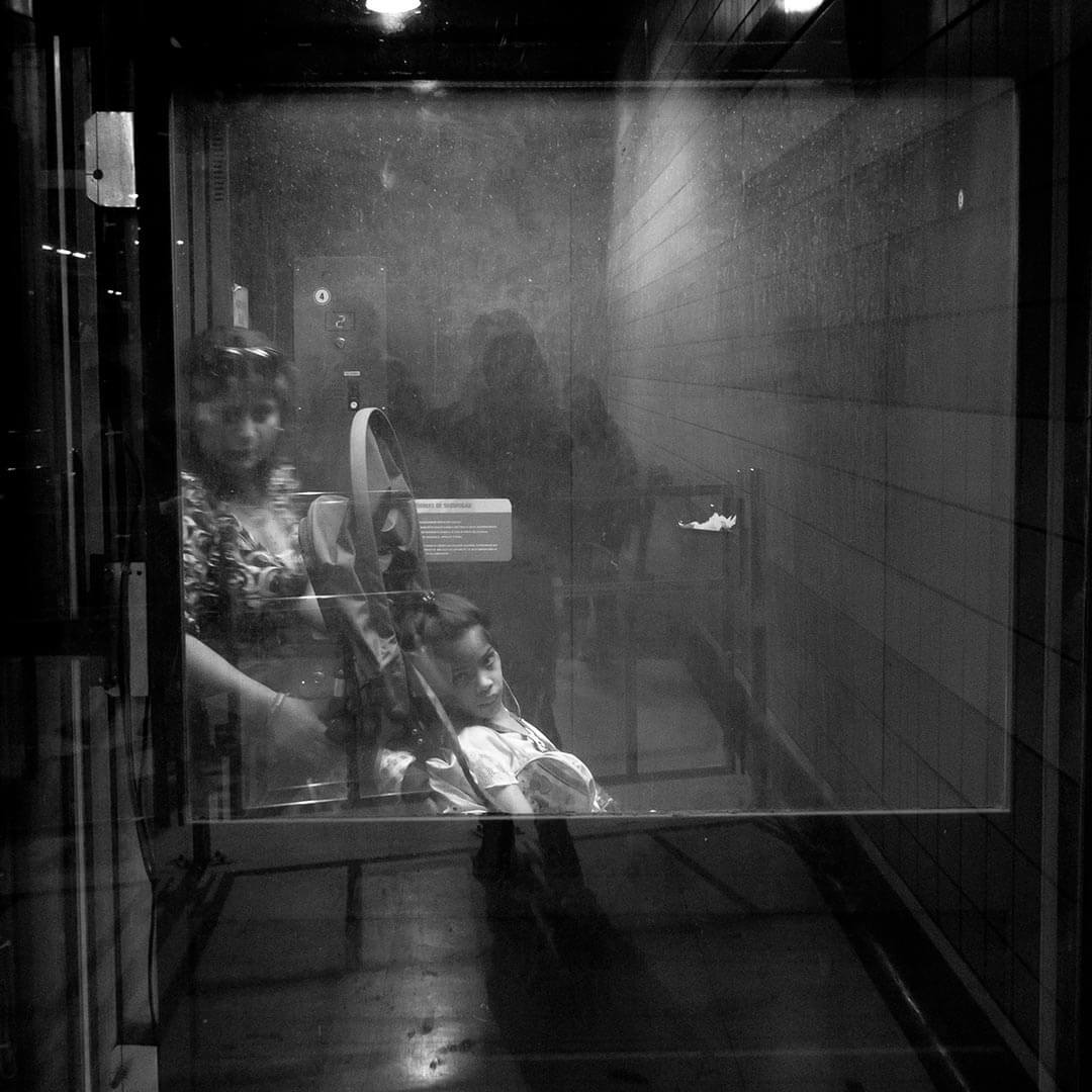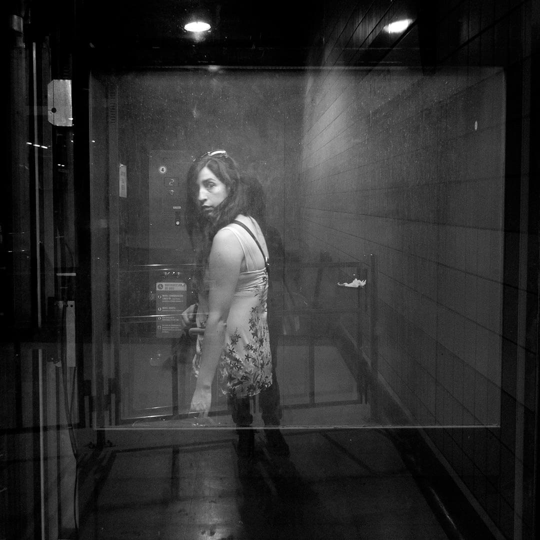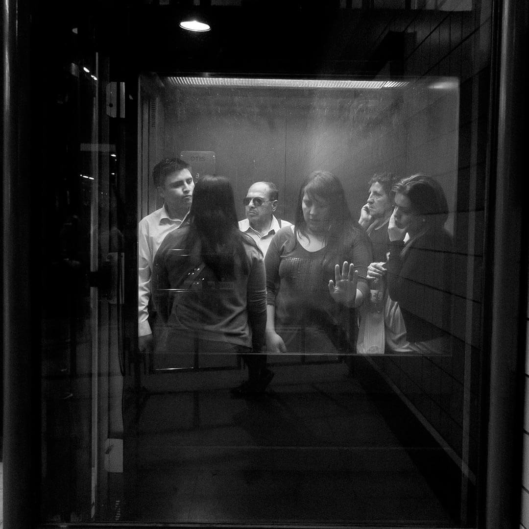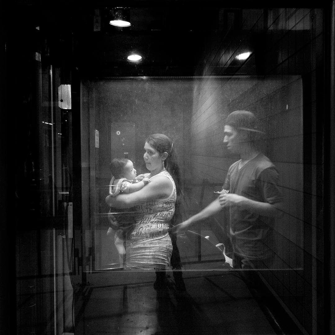 La serie m2, muestra un fragmento del espacio público, ocupado por personajes anónimos, encerrados en un oscuro cubículo, abstraídos o descubiertos, subiendo o bajando…atrapados.