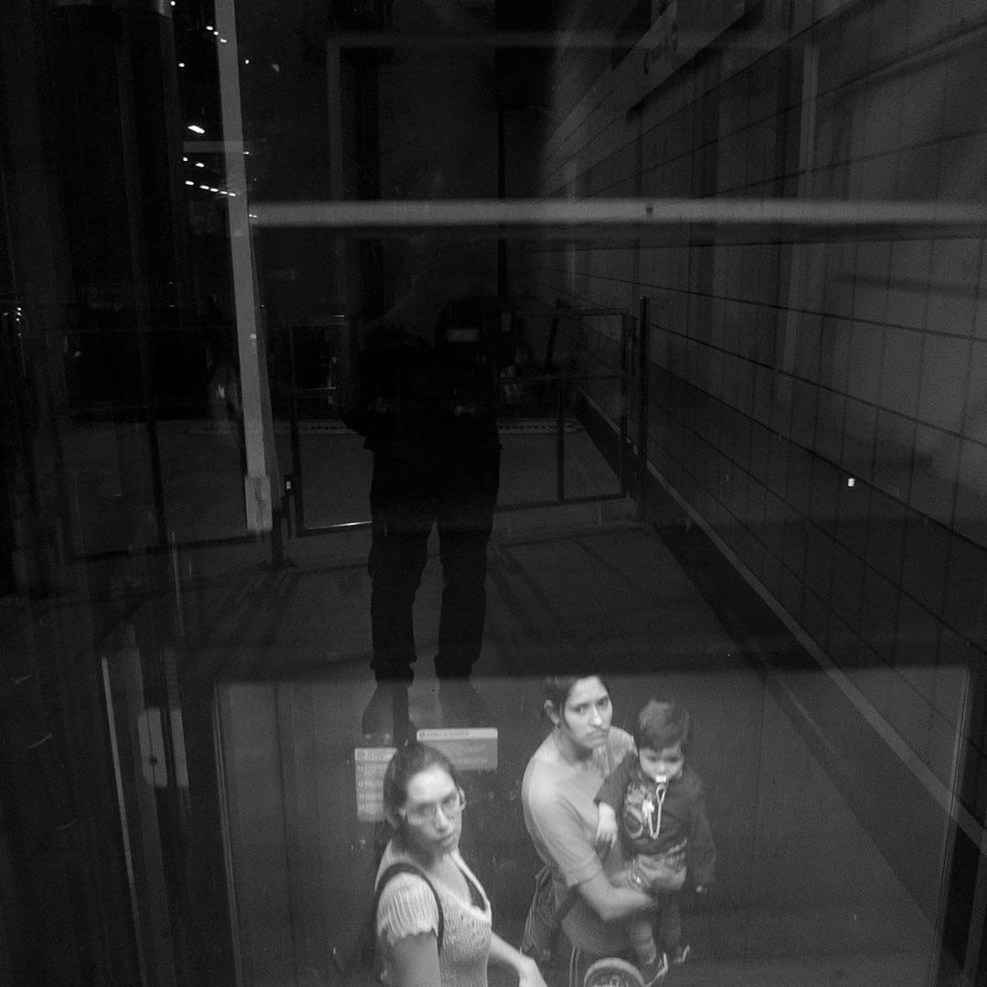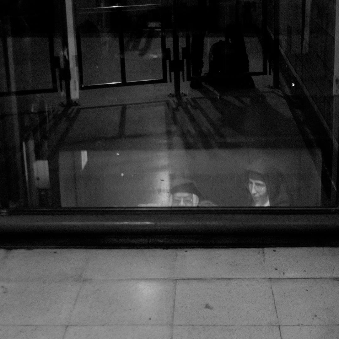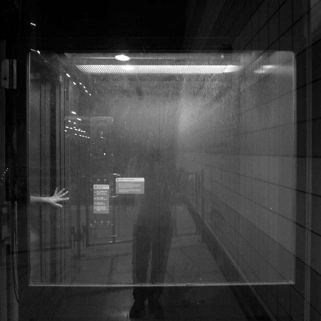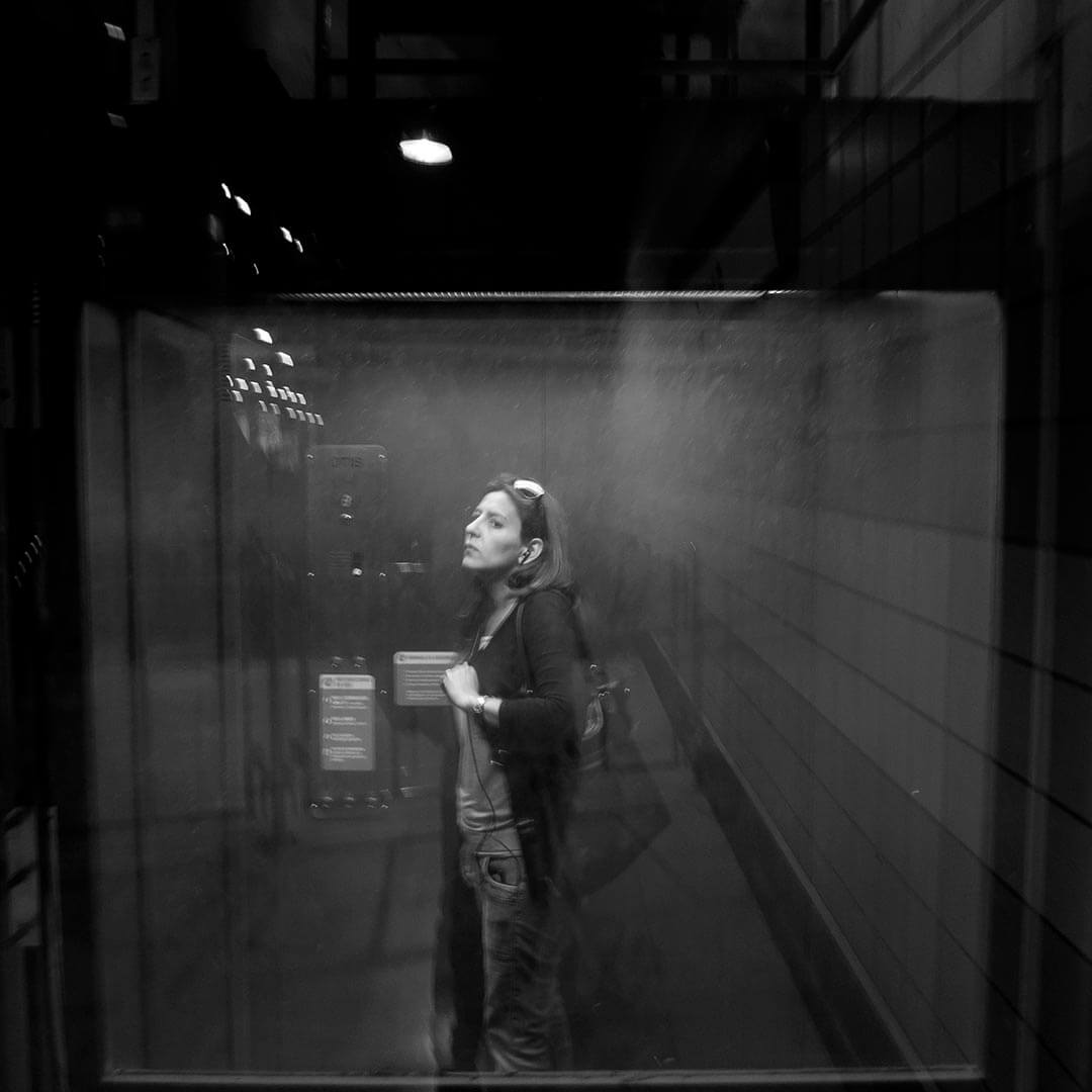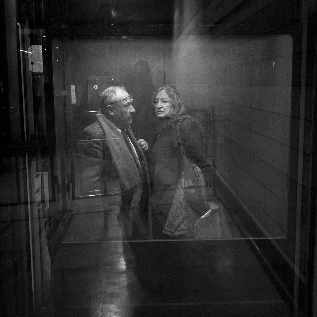 La serie m2, muestra un fragmento del espacio público, ocupado por personajes anónimos, encerrados en un oscuro cubículo, abstraídos o descubiertos, subiendo o bajando…atrapados.